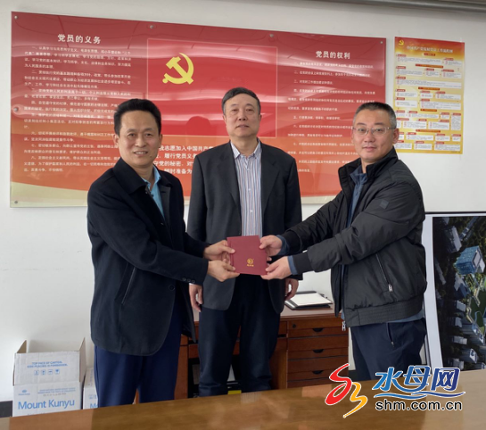 上图为:烟台市政协委员、山东恩来得实业有限公司董事长董凤立先生(左)在烟台市红十字会副会长尼安宁(中)的见证下将恩来得多功能健康鞋卡交予莱山区黄海路街道党工委书记姜剑锋(右)。